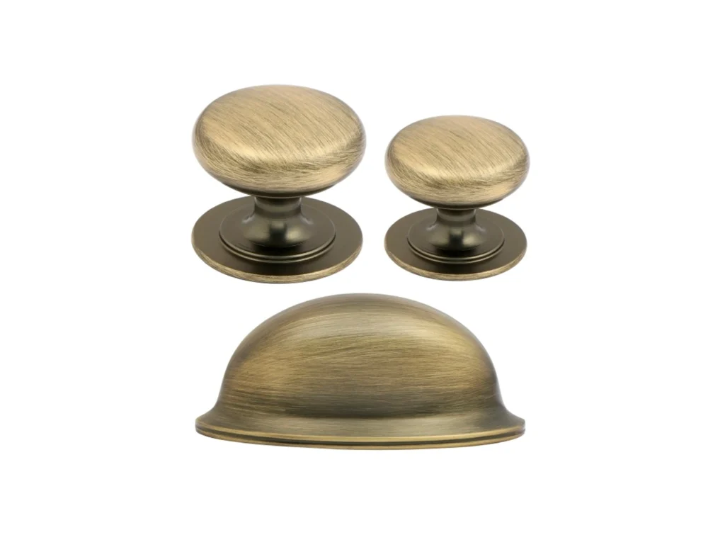 • Collection of beautiful light bronze cup handles with matching knobs