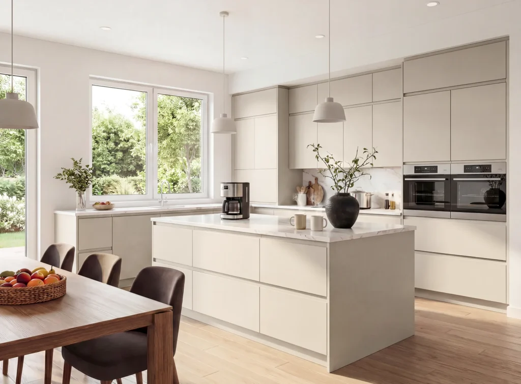 The Alaska Cashmere Superior Matt Vinyl offers a refined and thoughtfully crafted design suitable for modern, classic, or transitional interiors. Featuring Matt Vinyl, this collection combines durability, stability, and high-end aesthetics. Whether you’re upgrading a full kitchen or adding functional storage to another space, the Alaska Cashmere Superior Matt Vinyl delivers exceptional performance and long-lasting quality. Our team also provides complimentary design services to help you customise layouts, finishes, and configurations to fit your home perfectly.